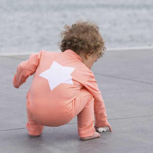 자외선 차단 기능이 탁월한 물놀이 모자로, 아이의 목 뒤가 타지 않도록 합니다. 0-2세용의 경우 끈이 달려있습니다.